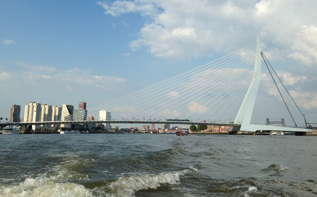 Johan had de hele dag gewerkt en sloot zich ’s avonds bij ons aan. We namen een watertaxi om aan de overkant van de Maas te komen. Het bootje vaart onder de Erasmusbrug door, echt zo leuk. Ik blijf die brug indrukwekkend vinden, wat een enorm ding. Waar mama (net zo’n angsthaas als ik) het een beetje eng vond, leek mijn pa er wel van te genieten. :)