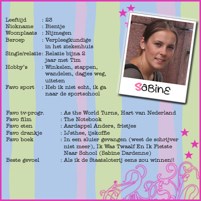 Sabine probeert altijd optimaal van het leven te genieten door leuke dingen te doen, ze zegt de dingen die ze op haar hart heeft direct en je weet dus heel goed wat je aan haar hebt.