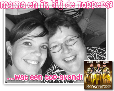 Angela 05 juni 2008 at 09:09 Wat leuk dat je er samen met je moeder heen bent geweest. Volgens mij zijn de concerten van de toppers echte feesten. Ik wilde ook gaan, maar vond het toch wat te duur..