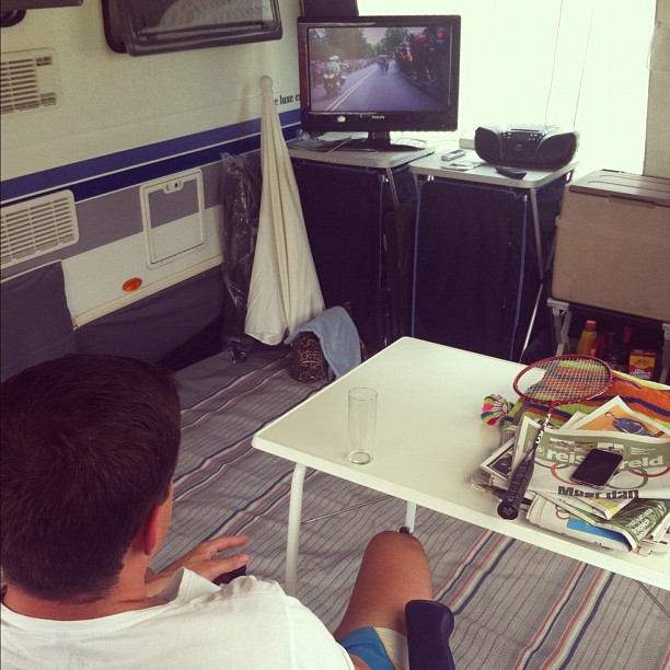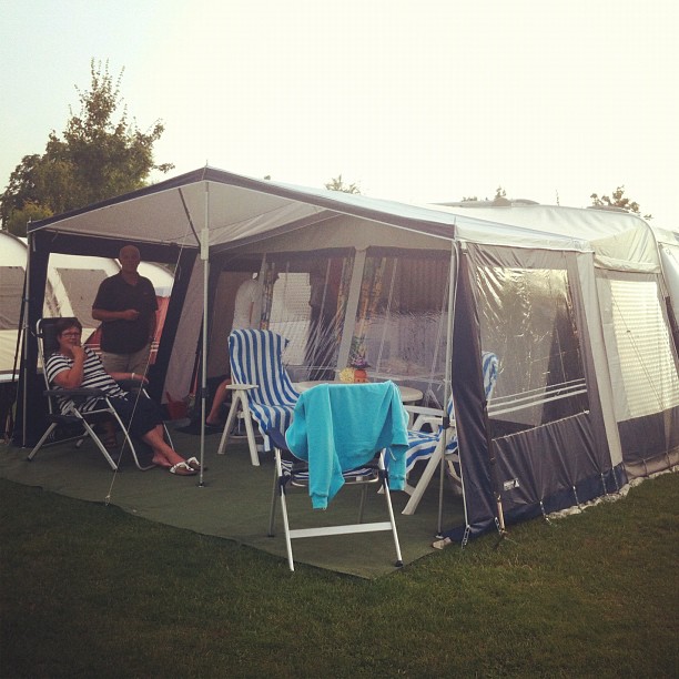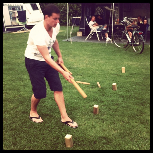 Mijn ouders zitten al een week op camping Marveld in Groenlo (4) en dus besloten we om daar gezellig een dagje op visite te gaan. Ze hebben altijd een tv bij zich, dus gelukkig konden we de Olympische Spelen gewoon volgen. (5) We gingen uiteten bij een barbecue-restaurant waar je zelf spiesen moest rijgen en vervolgens braden. (6) Natuurlijk moesten al die calorieén er ook weer af, dus deed ik (net als vroeger) een fanatiek potje badminton met mijn pa. (7 t/m 9) Johan waagde zich aan een of ander spel met houten klosjes, dat hij en mijn pa van de overburen hadden geleend. (10)