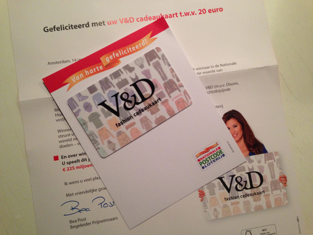 Pien en Daan wonen om de hoek en hebben daarom dezelfde postcodecijfers. Ze vroegen ons of wij soms ook een cadeaukaart van V&D hadden gewonnen? Wij hadden die nog niet gezien, eigenlijk belandt post van de Postcodeloterij altijd bij het oud papier, maar thuis aangekomen bleek dat ik ‘m gelukkig nog niet had weggegooid. Toch een leuk kadootje!