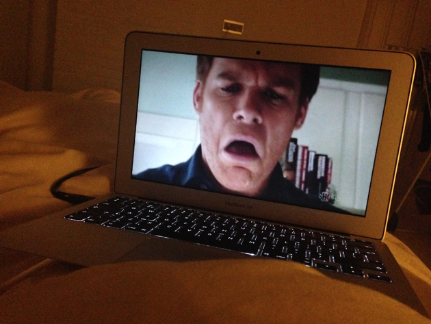 Het laatste seizoen van Dexter staat helaas nog niet op Netflix, maar ik kon echt niet meer wachten en heb het dus gedownload. Elk vrij moment benutten we om een aflevering te kijken, vaak lekker in bed. Sorry Dex, niet zo’n best screenshot dit. ;)
