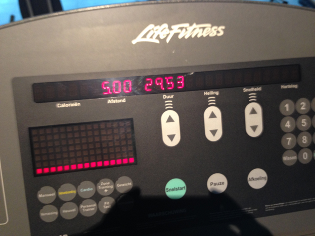 Zondag moest ik sporten, maar omdat we ’s middags naar de film zouden gaan, moest het wel ’s ochtends. Ik was toch al vroeg wakker, dus ging ik om 10.00 uur op weg naar de sportschool. Ik leek wel gek, haha! Het ging helaas een stuk moeizamer dan donderdag en ik hield het bij 5 km voor gezien. Wel trainde ik nog op de apparaten en zwom ik weer 25 baantjes. Prima work-out!