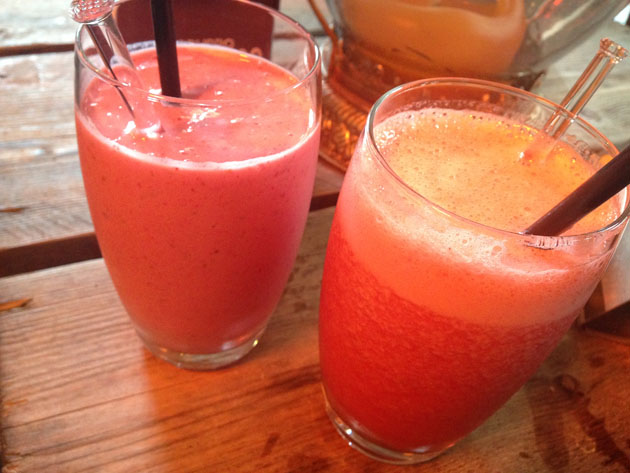 En even een drankje, shoppen maakt dorstig. Ondanks het slechte weer stonden er diverse terrasjes uitgestald. Bij Suikerburg zaten we lekker warm onder de heater aan een smoothie.