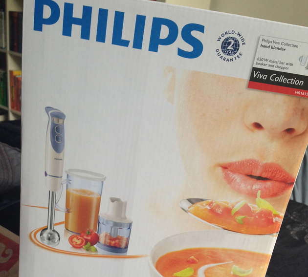 Mijn staafmixer kwam binnen, jeeeej! Nu kan ik eindelijk ook verse soepen maken. Ook zit er een hakmolentje bij, wat erg handig is aangezien ik geen keukenmachine heb. Dingen fijnmalen kan nu dus ook, whoei!