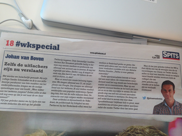 Vrijdagochtend: een column van Johan in Sp!ts, leukkk! Over het social media-gebruik onder sportjournalisten tijdens zo’n groot toernooi als het WK.