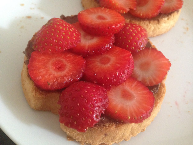 En beschuit met Nutella en aardbeien als lunch. Echt een traktatie!