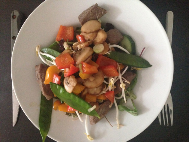 Vrijdagavond aten we een jummie biefstuksalade met sla, paprika, champignons, peultjes, bosuitje en taugé in teriyaki-woksaus.
