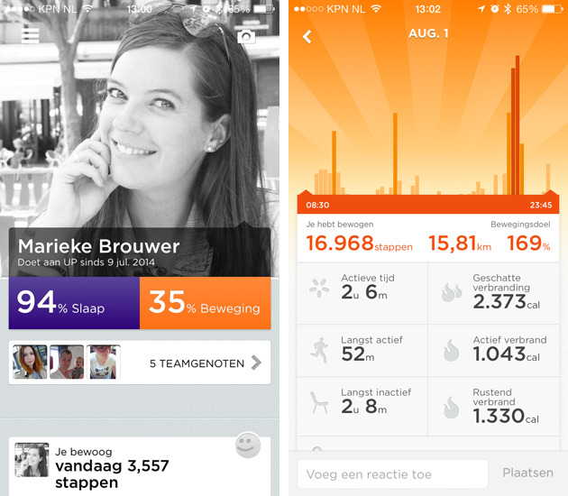 Daarnaast kun je teamgenoten toevoegen, wiens activiteiten je dan ook krijgt te zien. Zo kun je elkaar aanmoedigen, erg grappig. Ook schotelt UP je dagelijks een aantal wist-je-dat!jes en je eigen gemiddelden voor.