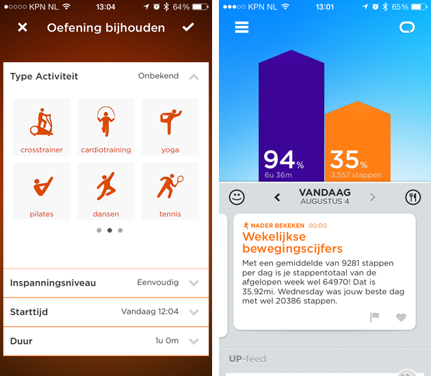 Je kunt de UP24 aan verschillende andere apps koppelen, zoals RunKeeper en MyFitnessPal. Helaas loop ik hard met de Nike Running-app, die dan weer net niet te integreren is. Je kunt wel handmatig sportsessies invoeren, zoals yoga, zwemmen, crosstraining en nog veel meer.