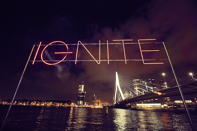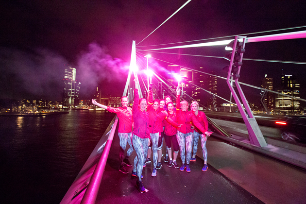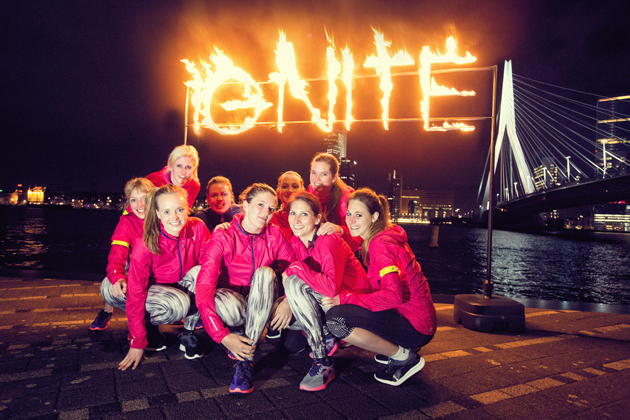Het was onwijs gaaf om Rotterdam in het donker te zien. Het blijft gewoon echt een mooie stad, met natuurlijk de Erasmusbrug als grote eye catcher. Het thema van de avond was ‘ignite your city’, dus was er ook vuur! Met brandende fakkels de brug af; echt megagaaf…