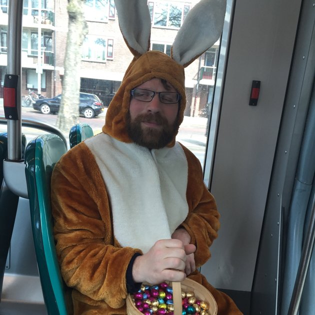In de tram op weg naar het station raakteéik aan de praat metédeze paashaas die me heel lief chocolade-eitjes gaf. Hij ging de hele dag geld ophalen voor de Rotterdamse ziekenhuizen. Mooie paasgedachte.