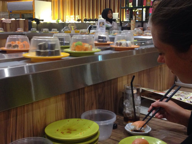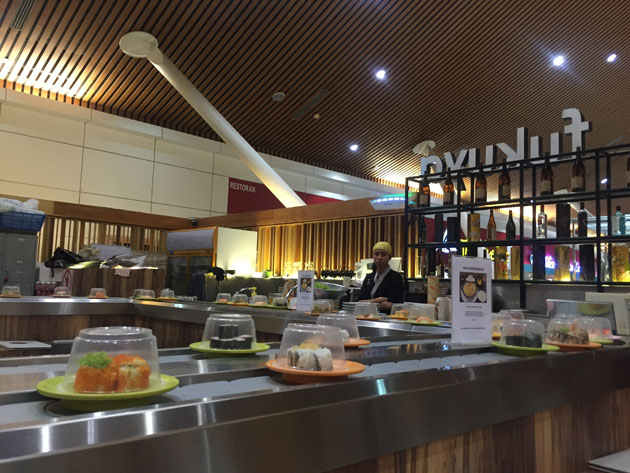 Dit verzacht de pijn enigszins: aangekomen op het vliegveld van Kuala Lumpur blijkt er een sushibar te zijn!