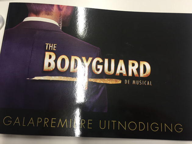 De volgende dag kreeg ik van mijn manager Debby de uitnodiging om naar de premiA?re van The Bodyguard-musical te gaan zondag. Ze kon zelf niet, dus mocht ik wel als ik wilde. Nou en of! Samen met musicalgekke-collega Fons meldde ik me aan.
