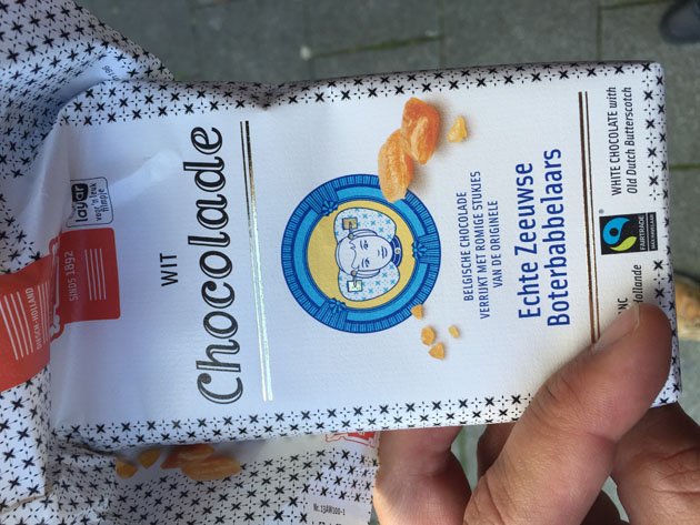 En bij Marqt konden we deze chocolade niet weerstaan. Ik ben al dol op witte chocolade, maar dan ook nog met stukjes boterbabbelaar… Oei! Ach, ik hoef toch die trouwjurk niet meer aan. ;)