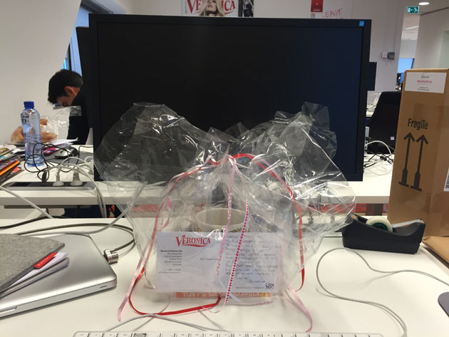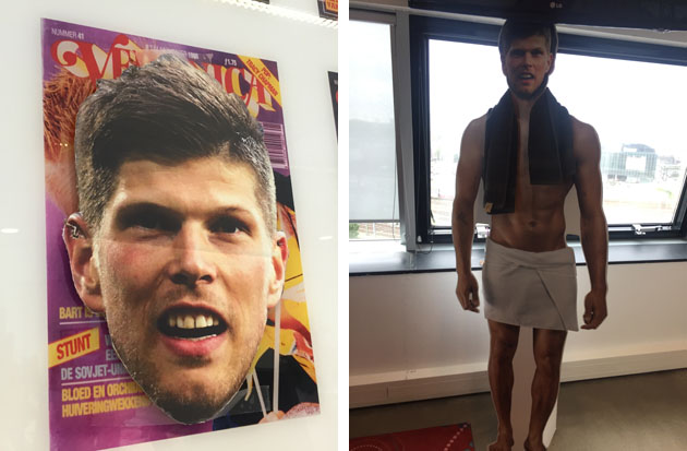 De Klaas-Jan-hoofden die mijn collega’s hadden gebruikt voor het hilarische bruiloftsfelicitatiefilmpje hierboven, hingen speciaal voor mij nog op de redactie én vlakbij mijn bureau!