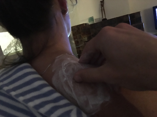 Dinsdag kreeg ik op m’n werk ineens vreselijk last van m’n nek en dat trok helemaal door naar m’n schouder. Misschien verkeerd gelegen of gezeten? Anyway, ik kon m’n hoofd amper draaien, dus Johan smeerde er ’s avonds tijgerbalsem op.