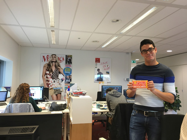 Donderdag was het de laatste dag bij Veronica Magazine van onze lieve collega Laura en daar baalden we flink van. Ze nam zelf onze favo Tony’s mee ter troost. Collega Fons poseert.